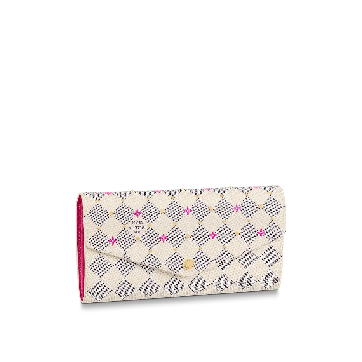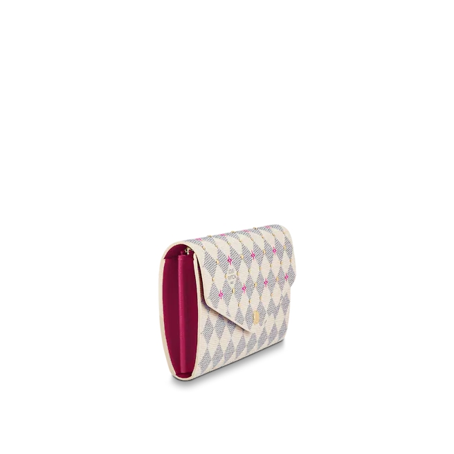 “Portefeuille Sala” reinterpreted for a special edition of the “Damie Azul Studs” collection. Damie Azul canvas with fuchsia pink floral motif print and delicate gold-colored studs. The enveloped wallet, which opens and closes with a snap button engraved with “Louis Vuitton”, is also practical, multifunctional and easy to organize.