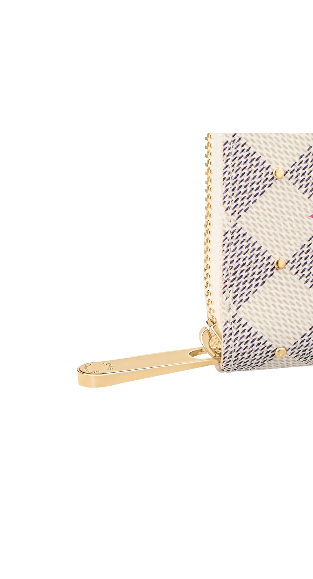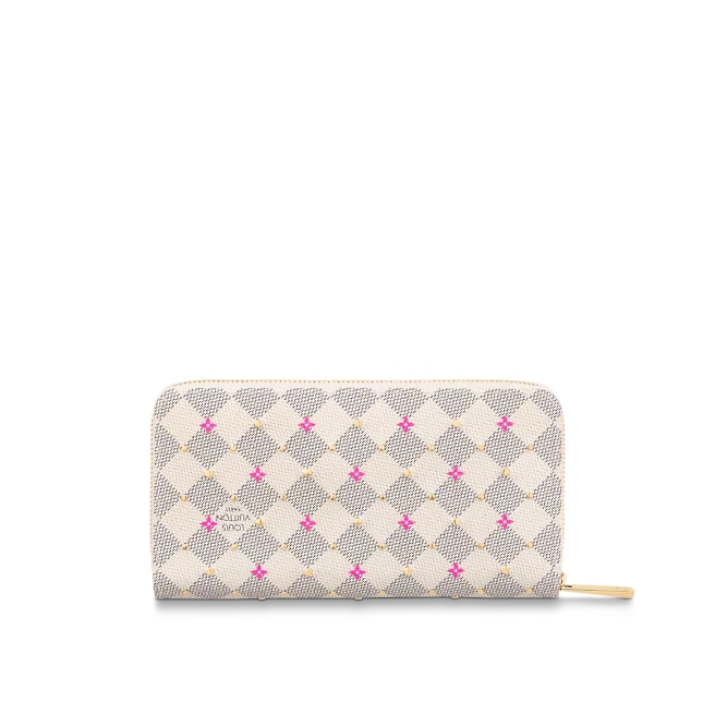 • “Zippy Wallet” reinterpreted for the “Damie Azul Studs” collection. Damie Azul canvas with fuchsia pink floral motif print and small gold-coloured studs. The contrasting pink lining that emerges when you open the reassuring round zipper and the interior with multiple compartments, pockets and card slots are also attractive.