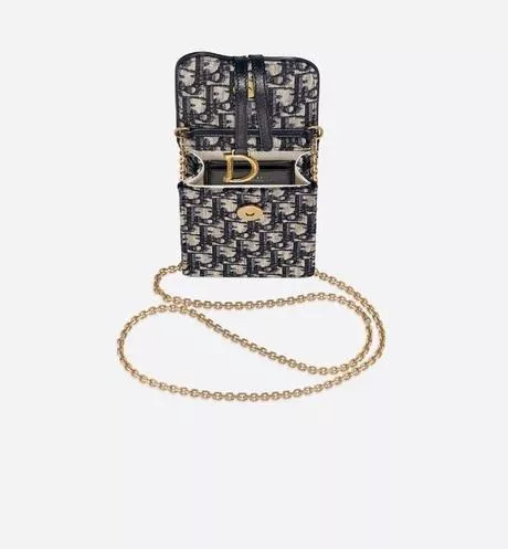 Vertical pouch in blue “Dior Oblique” jacquard and studded with “saddle” line cords. The rectangular design features an asymmetrical flap and a “D” charm to keep your essentials safe. On the inside, it has a main compartment with excellent storage capacity and two card slots. With a detachable chain, it can be used on the shoulder or crossbody, as well as in a handbag.
